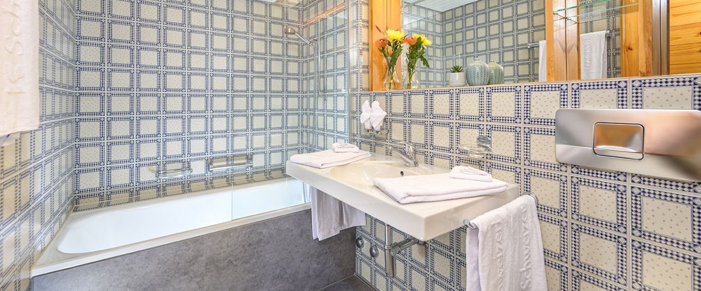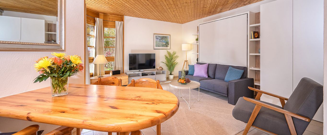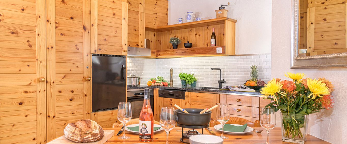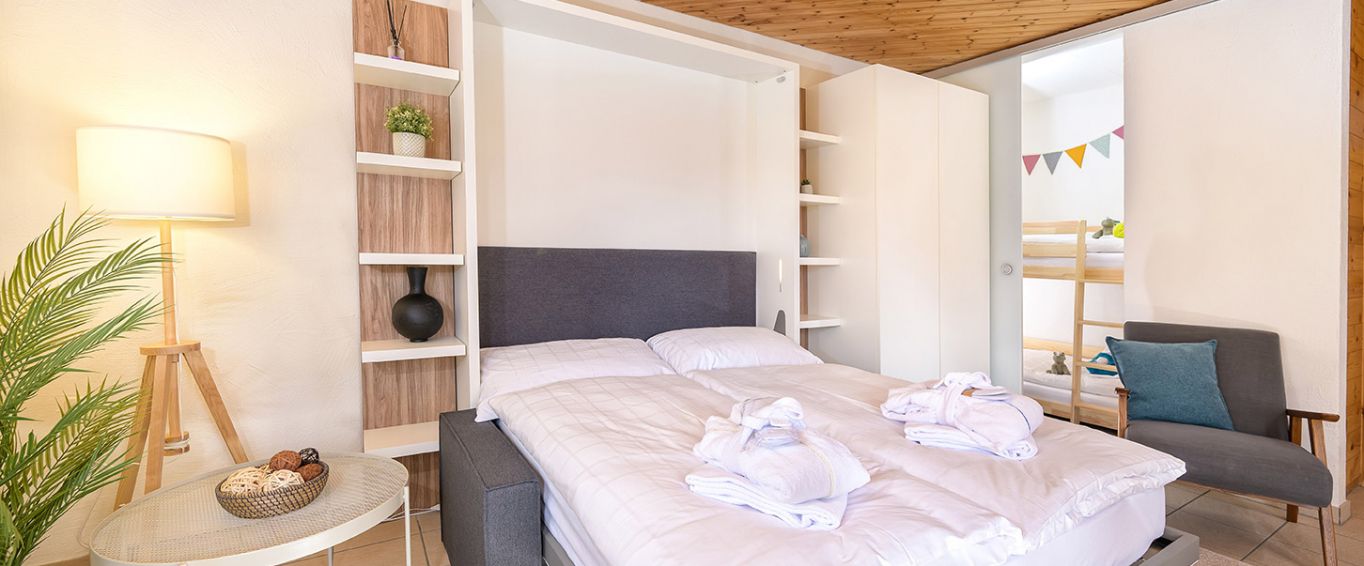 Die ca. 40 m² grosse 1,5-Zimmer-Ferienwohnung im Gebäudeteil 5 des Nebenhauses des Hotels Schweizerhof bietet Platz für bis zu vier Personen und ist perfekt für zwei Erwachsene mit bis zu zwei Kindern.
