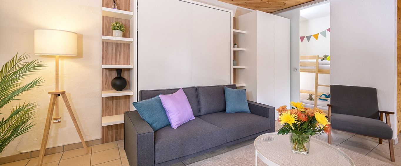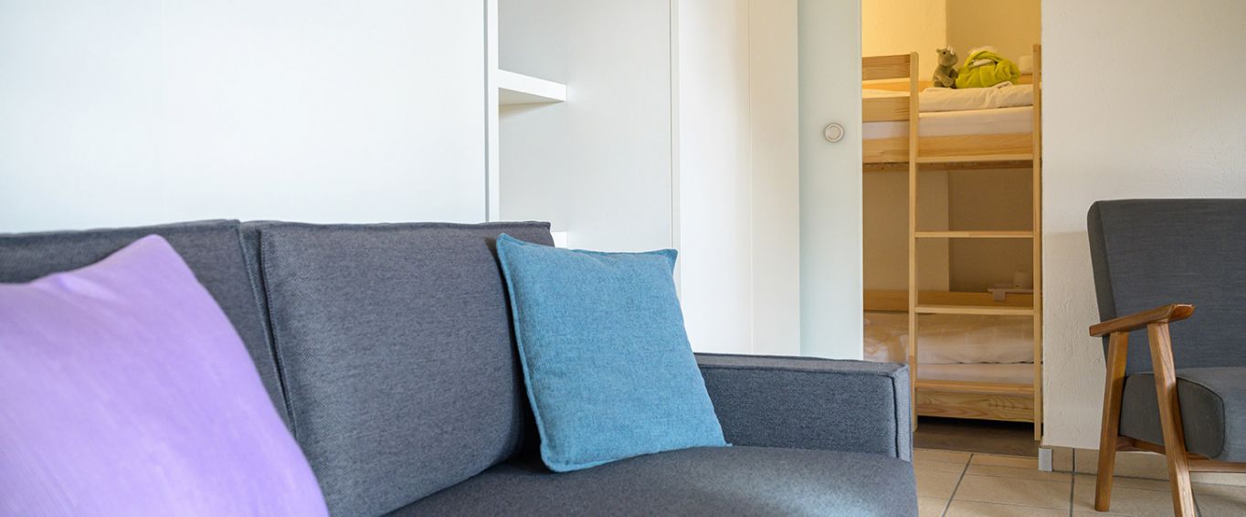 Der helle Wohnraum ist offen gestaltet und bietet eine moderne Küche mit Essbereich, ein praktisches Schranksofa mit zwei Einzelbetten sowie TV, DVD/Blu-ray, Bluetooth-Lautsprecher und weitere Annehmlichkeiten.