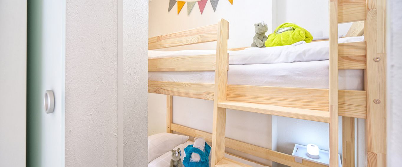 Die Wohnung wurde kürzlich teilweise renoviert und mit hochwertigen Materialien sowie modernster Ausstattung eingerichtet. Im separaten, liebevoll gestalteten Kinderbereich befindet sich ein stilvolles Etagenbett mit integrierter Beleuchtung – ein gemütlicher Rückzugsort, der Kindern wie kleinen Abenteurern Freude bereitet.