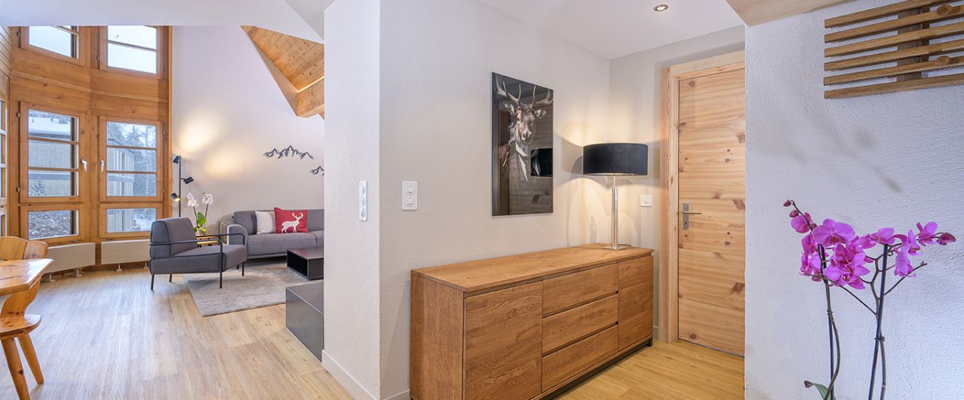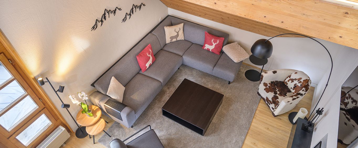 Charming holiday flat with two separate bedrooms, one of them on the gallery, is approx. 80 sqm and located on the top floor. Balcony with view to the "Lenzerhorn" with south-east orientation, a lift leads from the underground car park directly to the flat on the 3rd floor. Two living areas with open kitchen (fully and high quality equipped with WMF appliances) and dining area as well as a toilet are located on the lower level. The lockable bedroom, another double bed on the gallery and a bathroom with shower (unfortunately without toilet) are accessible by a spiral staircase. The underground parking space number 532 can be booked additionally if required, we offer WLAN free of charge.
